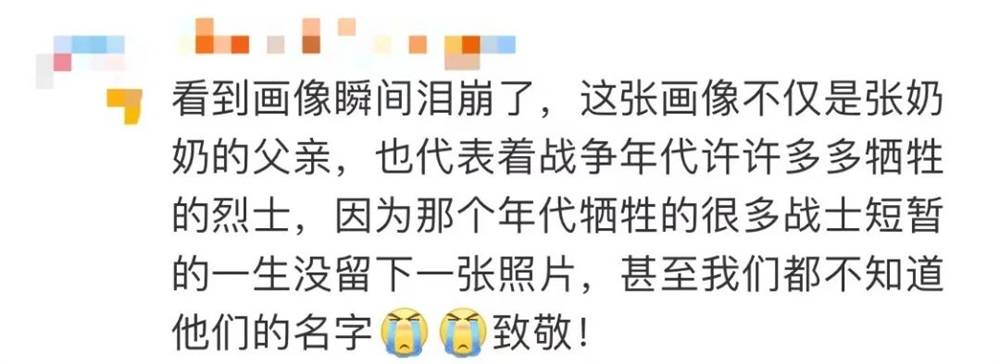 网友们纷纷评论:“这张画像是张奶奶的父亲,也代表着战争年代许许多多牺牲的烈士。很多牺牲的战士,短暂的一生没留下一张照片,我们甚至都不知道他们的名字”