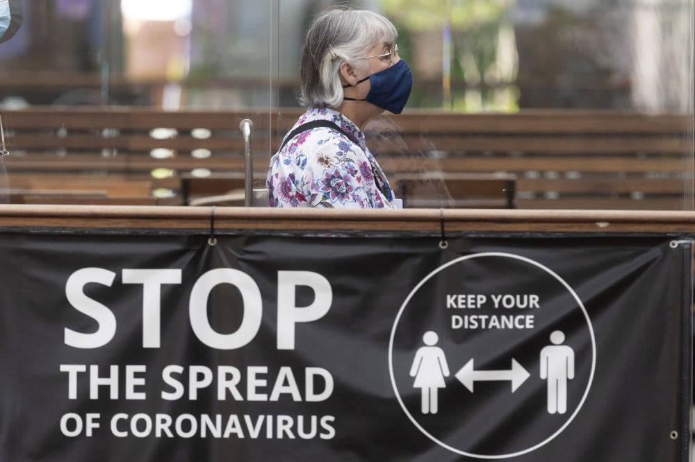 ▲2021年7月19日,一名戴口罩的女子从英国伦敦考文特花园的一处安全提示牌旁走过。