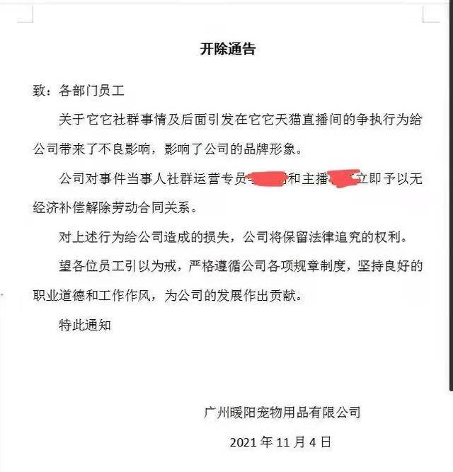 而开除通告称,“关于它它社群事件及后面引发在它它天猫直播间的争执行为给公司带来了不良影响,公司对事件当事人社群运营专员和主播立即予以无经济补偿解除劳动合同关系。”