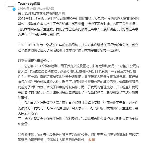 当天,经认证的@Touchdog 官方微博发布道歉声明称,它它有600多个微信社群,所有社群均使用3个粉丝(非公司内部人员)作为管理员协助管理。其中,90号群管理员此前为活跃气氛,修改了等级名称,但由于管理疏忽,公司并未检查、发现等级名称的问题。声明承认,“官方的社群运营人员在面对客户质疑时并未解决问题,进而激化了矛盾”。