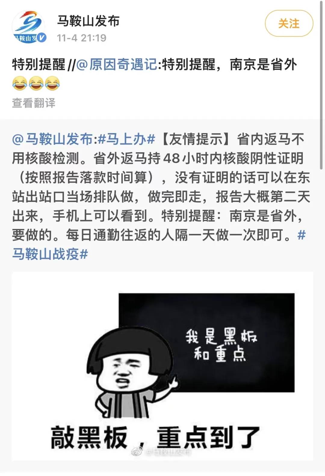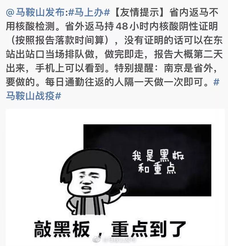 @马鞍山发布 还特别强调了一句:“特别提醒:南京是省外,要做的。每日通勤往返的人隔一天做一次即可。”