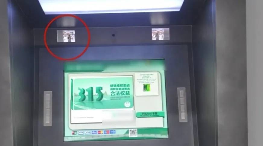 普通的ATM机只有位于机器上方中间位置的一个摄像头,而这台ATM机的上方左侧位置竟然还隐秘设有一个针孔摄像头;