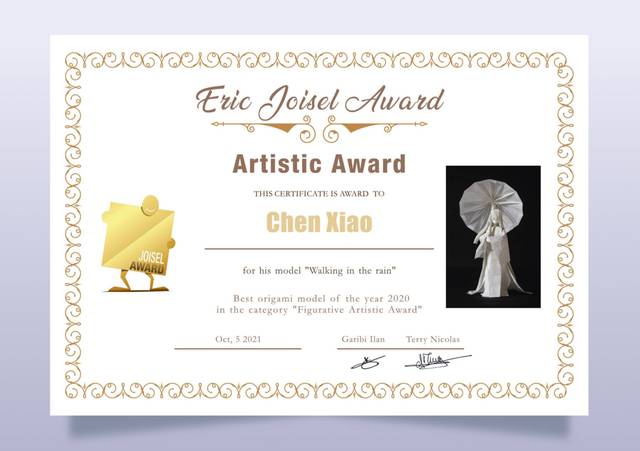 今年10月,得知自己获奖消息时,陈晓又惊又喜,“因为Eric Joisel是我非常崇拜的一位大师,能够得到以他名字命名的奖项,是对我折纸这么多年来的肯定。”
