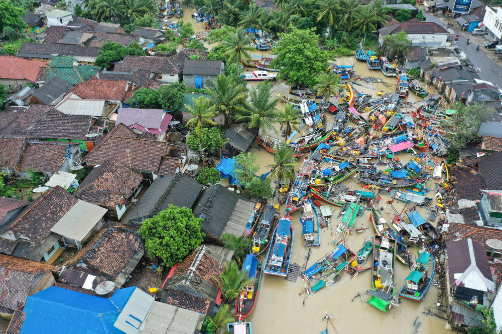 ▲这是2018年12月25日在印度尼西亚万丹省板底兰县拍摄的遭海啸袭击后的托洛村,村子里近500艘渔船在海啸袭击后受到不同程度的损伤。(新华社记者 杜宇摄)