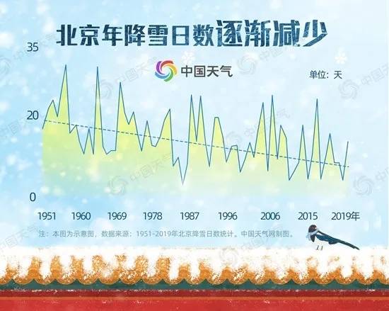 数据统计显示,1967年至1976年10年间北京年均降雪日数达16天,2007年至2016年10年间,年均降雪日数下降至10天。