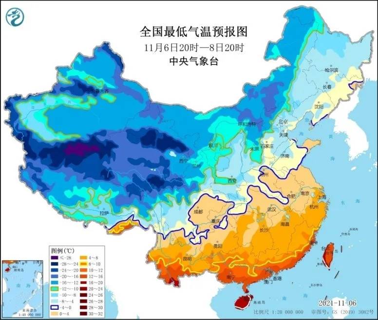 大部地区气温将先后下降8~10℃,西北地区东南部、内蒙古中部和东南部、华北、东北地区中南部、黄淮、江淮、江汉、江南北部等地部分地区降幅可达12~14℃,局地16℃以上。降温过后,最低气温0℃线位于苏皖北部、河南中部至四川北部一带,华南中北部最低气温将降至10℃以下。