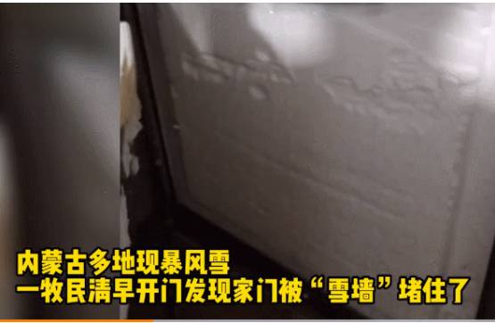 在内蒙古包头,一牧民开门发现风吹雪堵了半截门,门口出现了雪墙,积雪深度达1米。