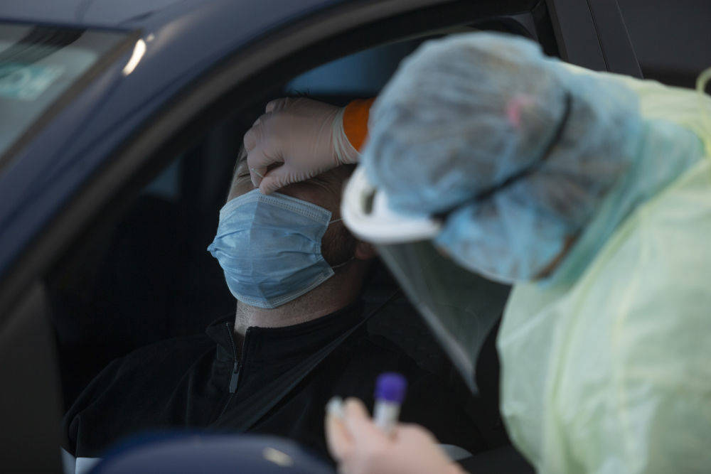 ▲2021年11月4日,在斯洛文尼亚首都卢布尔雅那,医务人员为新冠检测者取样。(新华社发)