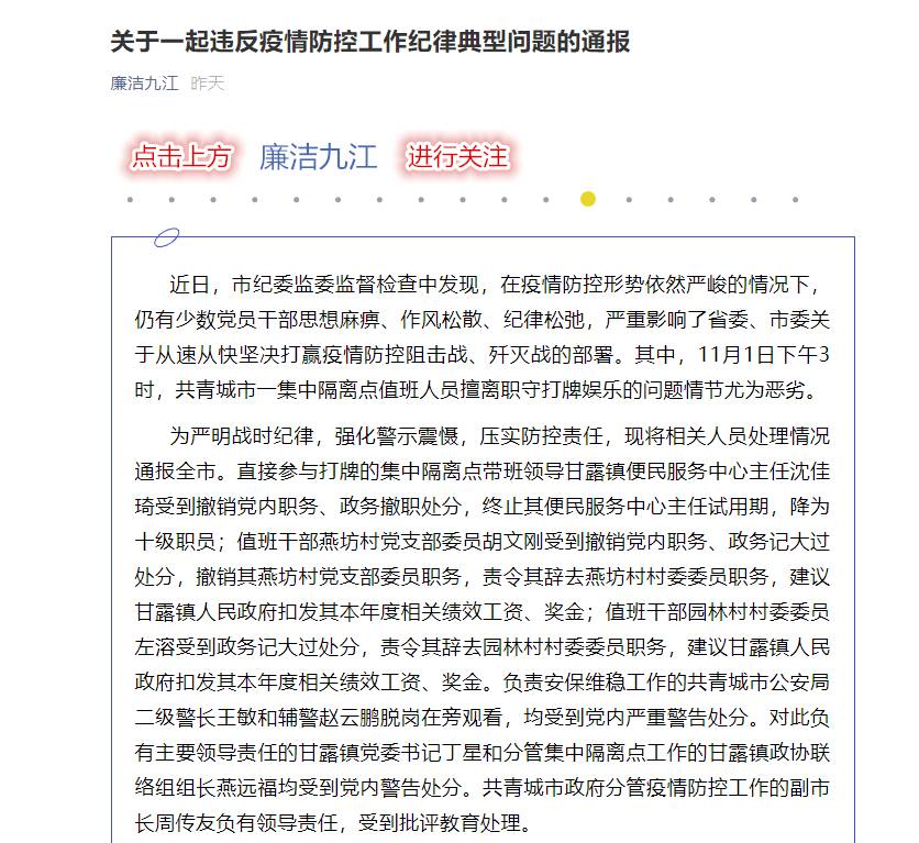 近日,市纪委监委监督检查中发现,在疫情防控形势依然严峻的情况下,仍有少数党员干部思想麻痹、作风松散、纪律松弛,严重影响了省委、市委关于从速从快坚决打赢疫情防控阻击战、歼灭战的部署。其中,11月1日下午3时,共青城市一集中隔离点值班人员擅离职守打牌娱乐的问题情节尤为恶劣。