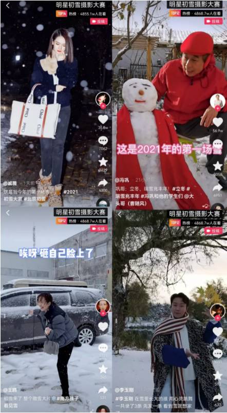 就连明星们也忍不住加入到了这场“初雪大战”中:戚薇雪地美美拗照型、王鸥晒出雪地打卡视频、李玉刚雪地热舞、冯巩堆雪人……