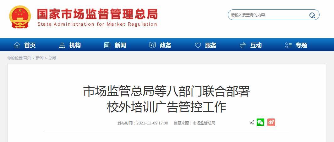 为进一步落实中共中央办公厅、国务院办公厅《关于进一步减轻义务教育阶段学生作业负担和校外培训负担的意见》(以下简称“双减”文件)有关要求,近日,市场监管总局会同中央宣传部、中央网信办、教育部、民政部、住房城乡建设部、国资委、广电总局研究出台《关于做好校外培训广告管控的通知》(以下简称《通知》),就做好校外培训广告管控工作作出部署。