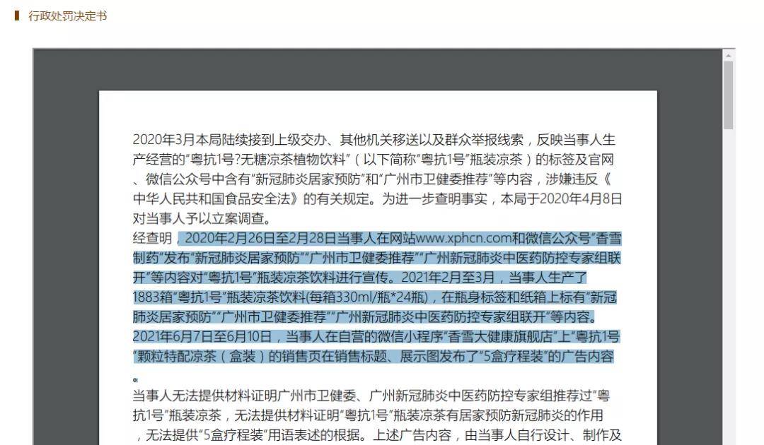 经查明,2020年2月26日至2月28日香雪医药在公司官网和微信公众号“香雪制药”发布“疫情居家预防”“广州市卫健委推荐”“广州疫情中医药防控专家组连开”等内容对“粤抗1号”瓶装凉茶饮料进行宣传。