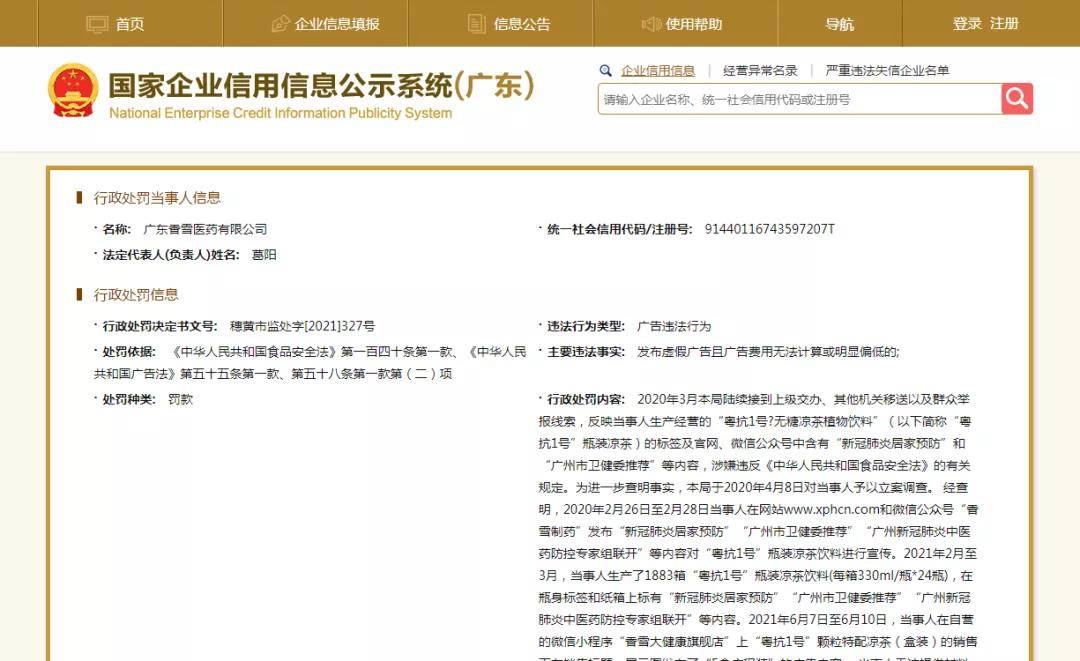 11月7日,香雪制药发布公告称,广州市香雪制药股份有限公司孙公司广东香雪医药有限公司于2021年11月4日收到广州市黄埔区市场监督管理局下发的《行政处罚决定书》,因公司香雪医药无法提供材料证明“粤抗1号”瓶装凉茶有居家预防疫情的作用,违反广告法,被责令停止发布广告并罚款30万元。