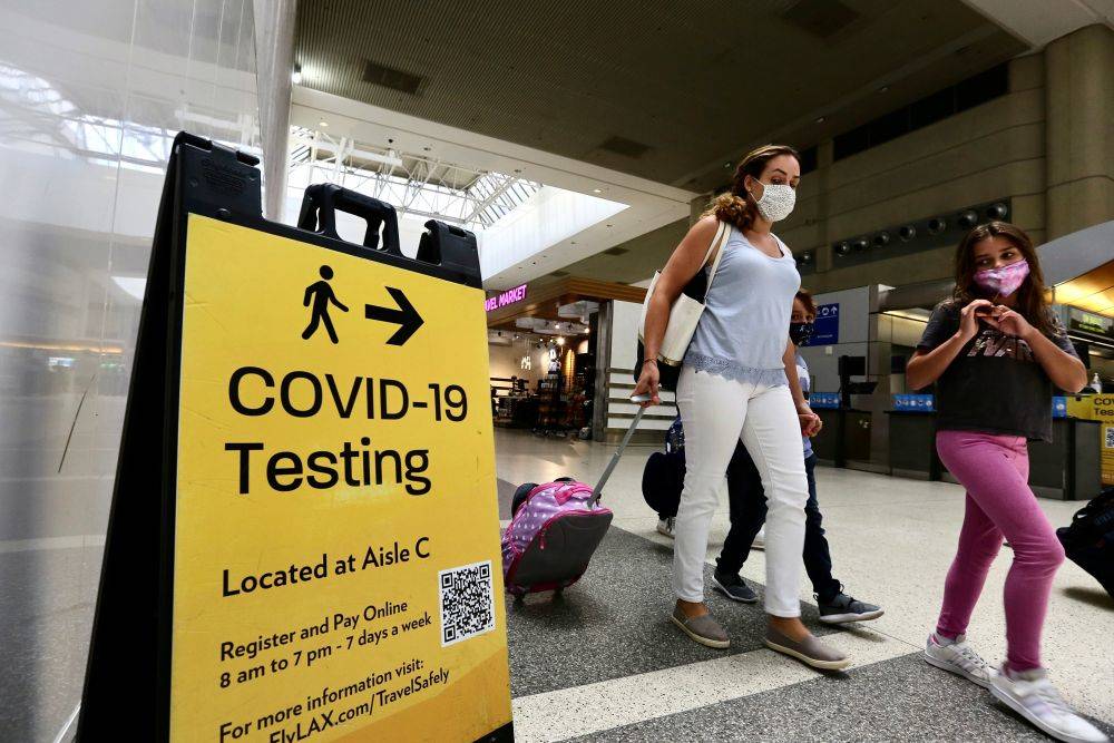 ▲7月18日,佩戴口罩的旅客走过美国洛杉矶国际机场内的一块新冠检测告示牌。新华社发