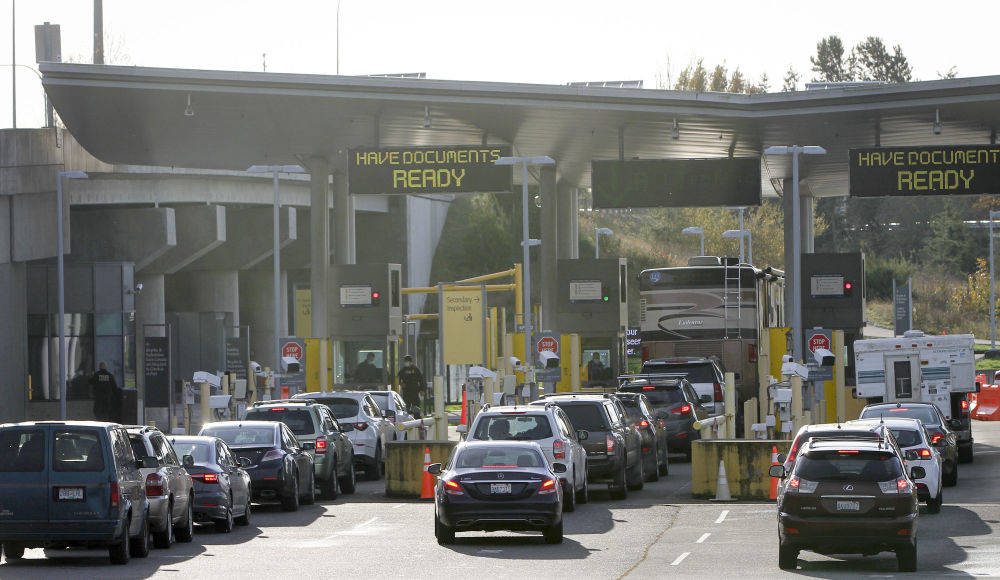 ▲11月8日,在加拿大萨里的加美边境,车辆排队准备驶入美国。新华社发 梁森摄