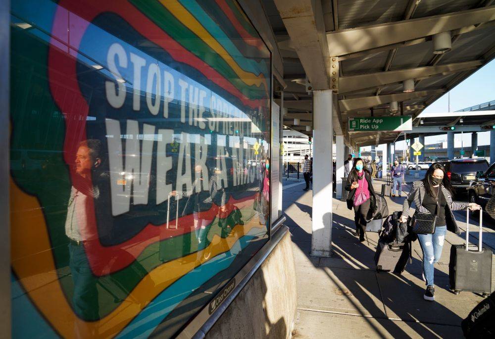 ▲ 11月8日,在美国纽约肯尼迪国际机场,旅客从写着“戴上口罩 阻断传播”的广告牌旁走过。新华社记者王迎摄
