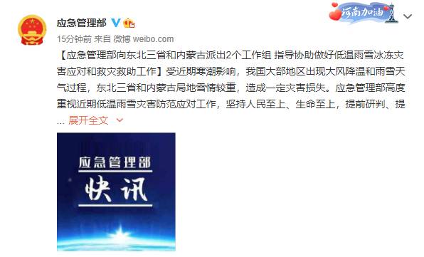 应急管理部高度重视近期低温雨雪灾害防范应对工作,坚持人民至上、生命至上,提前研判、提早部署,部长黄明主持召开视频调度会,就加强抗灾救灾工作做出部署安排、提出明确要求,部领导坚持每日调度会商,会同气象等有关部门持续分析研判,并调度消防救援队伍投入抢险救援处置,11月9日紧急派出2个工作组赶赴内蒙古、辽宁、吉林、黑龙江,指导协助地方做好灾害应对和救灾救助等工作。