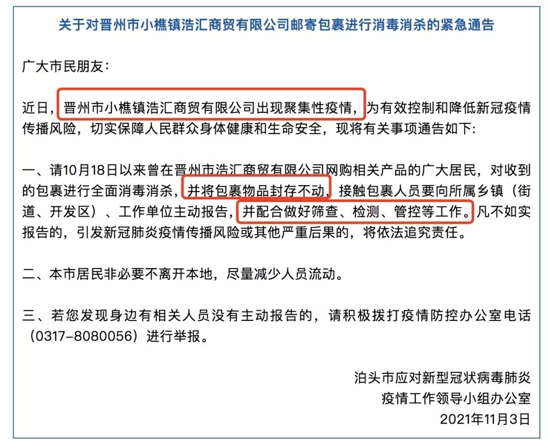 截至目前,河北已有7地发布关于对晋州市浩汇商贸有限公司邮寄包裹进行消杀管控的紧急通告。