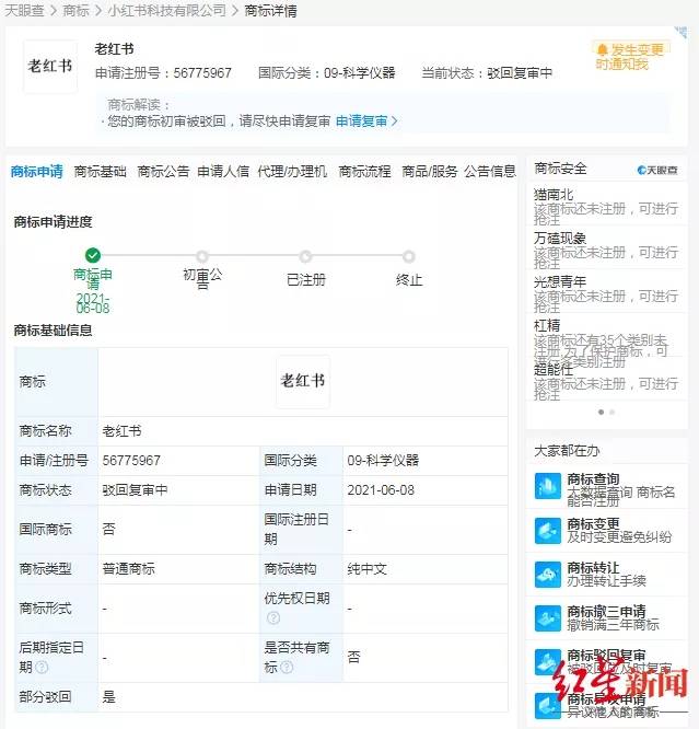 红星资本局11月10日消息,小红书科技有限公司申请的“老红书”商标状态日前变更为驳回复审,该商标国际分类涉9类科学仪器。
