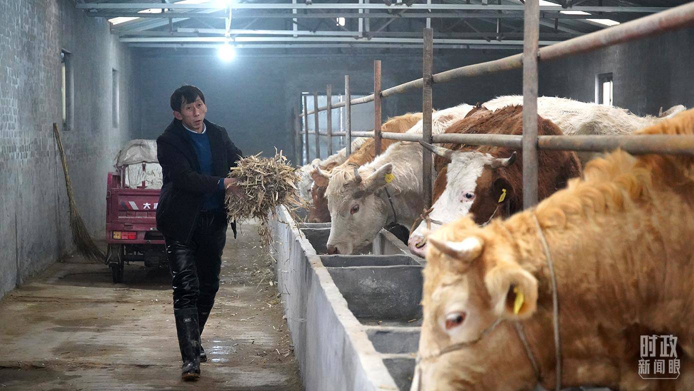 ▲段村经济合作社养牛基地,工作人员正在添饲料。(总台央广记者潘毅拍摄)