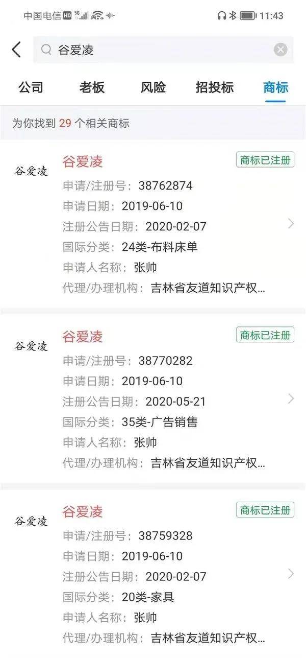 记者通过天眼查查询发现,“谷爱凌”商标申请信息有29条。其中,自然人张某于2019年6月申请的11个“谷爱凌”商标已完成注册,国际分类涉及教育娱乐、广告销售、布料床单等。其他公司及自然人申请的“谷爱凌”商标流程显示为“被驳回”或“商标无效”。