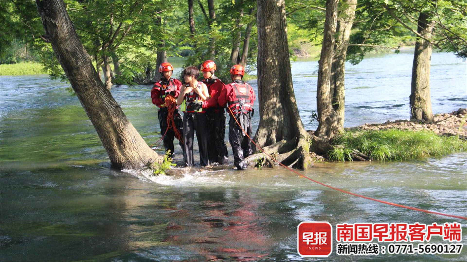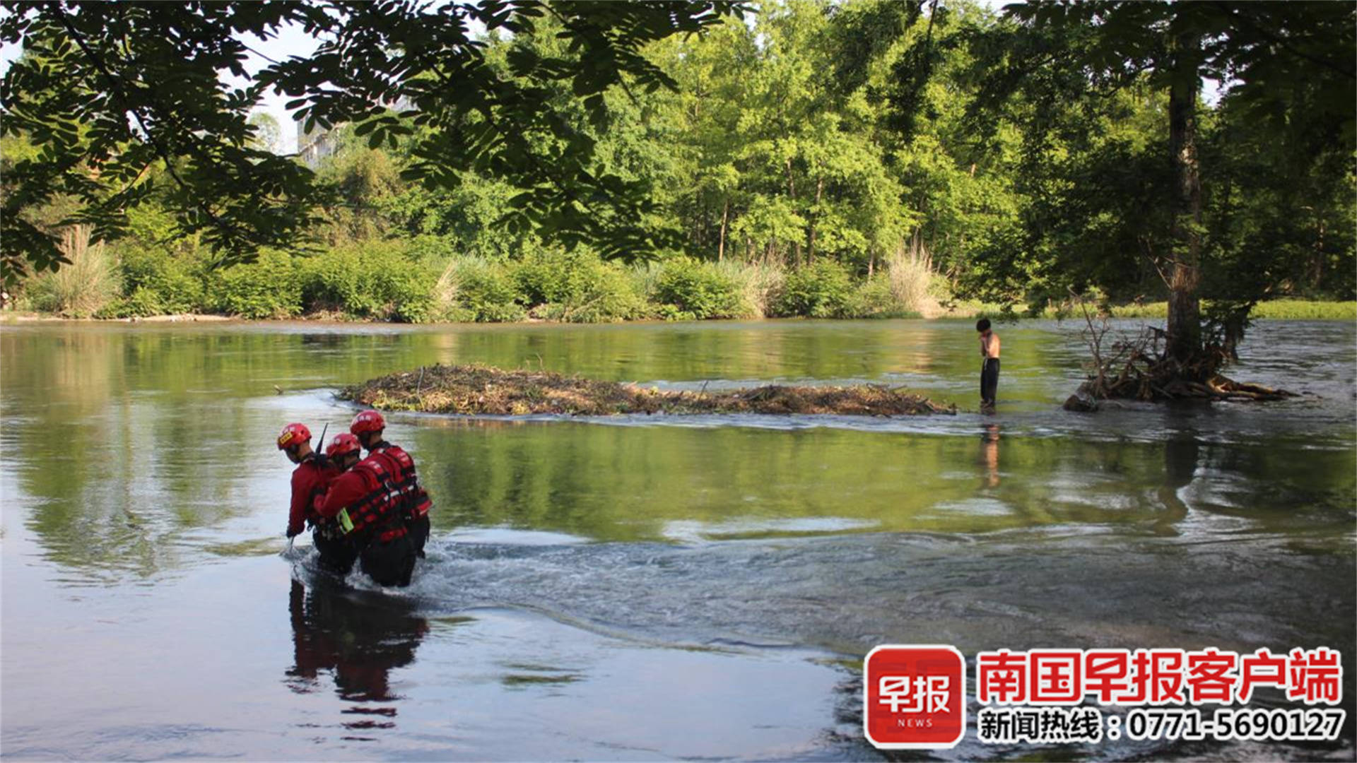 5月4日下午,在桂林灵川县灵川镇山口村,3名14岁的男孩在河边玩耍,其中一男孩下河游泳,因水流湍急被困河中,幸好消防员赶来将他救上岸。