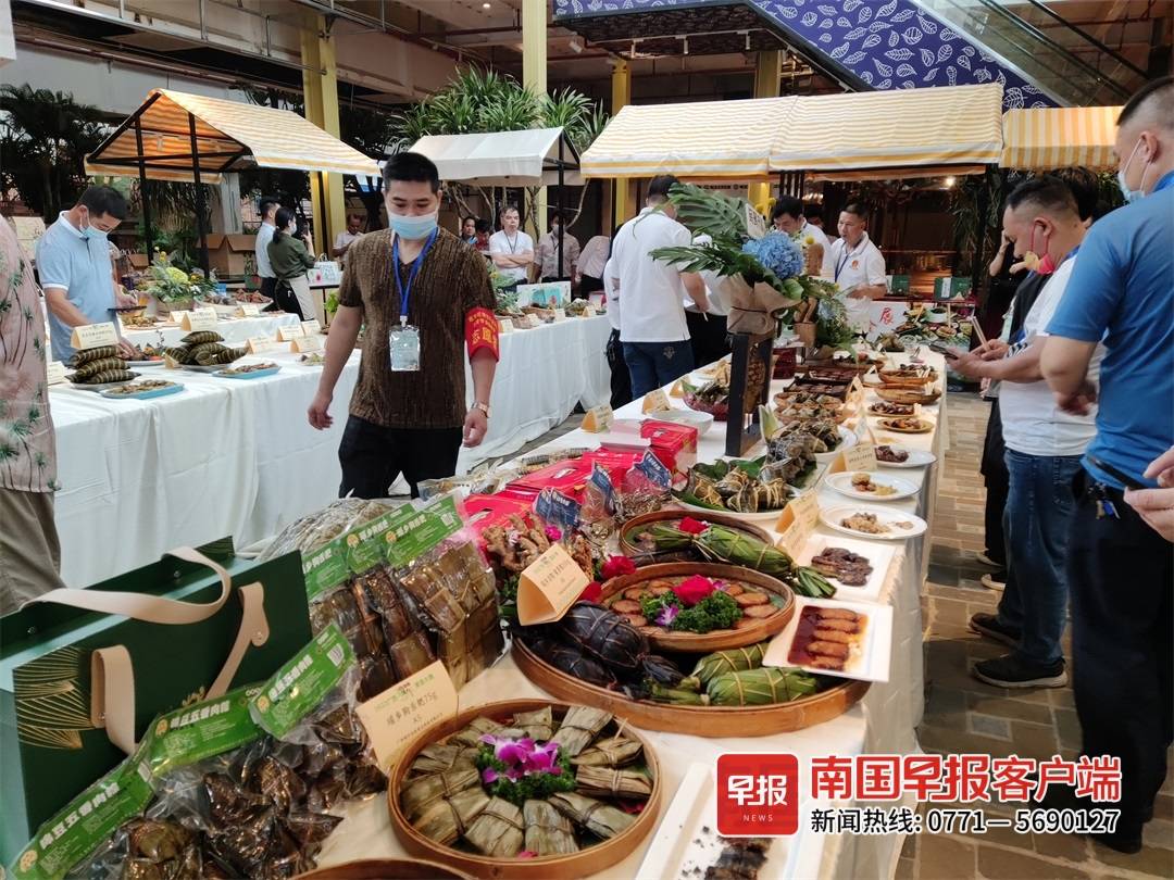 当天共有120多种不同口味的粽子参评,粽子的制作大多取材于本地特色食材,别具匠心,如灵山猪蹄、博白假篓、东兰墨米等。