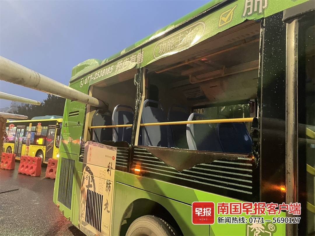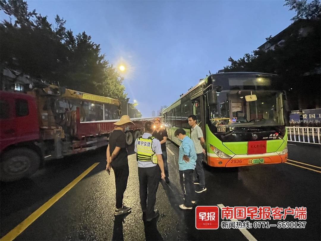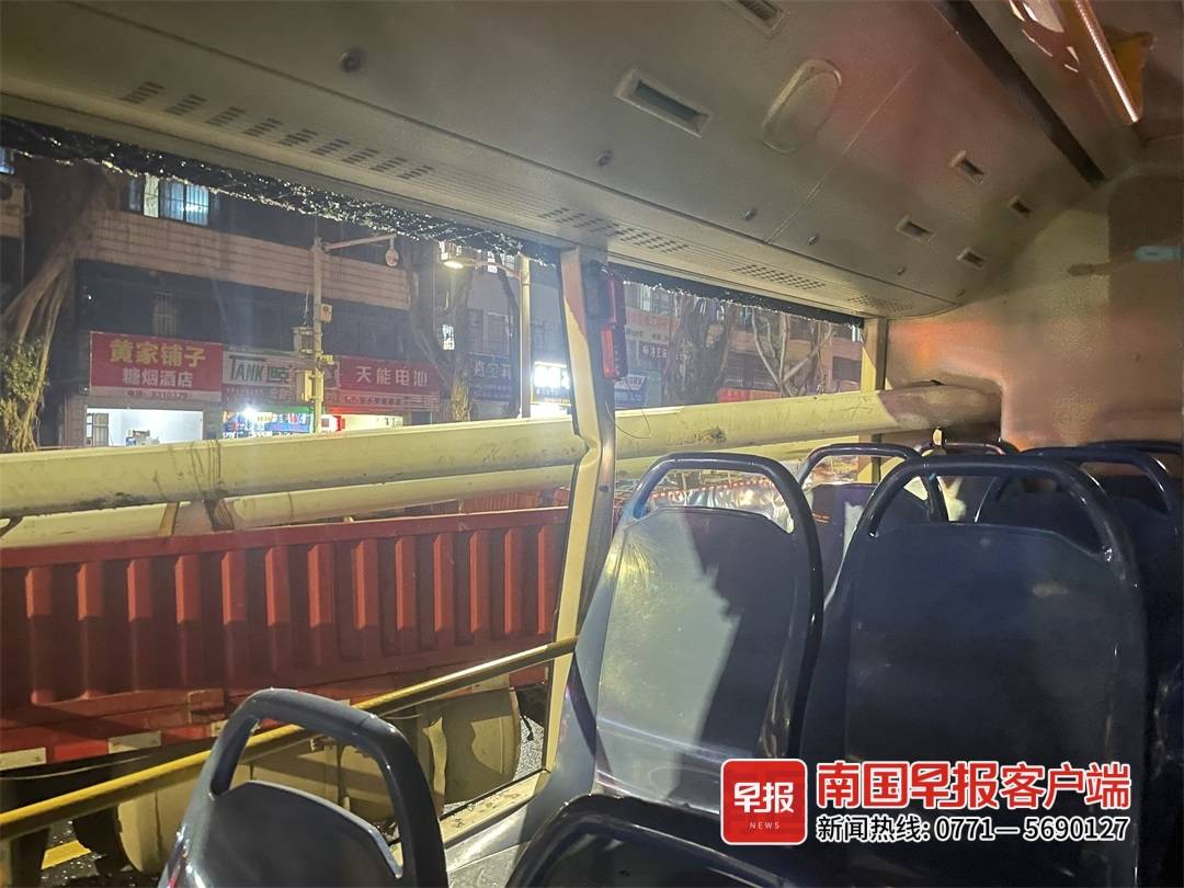 5月22日18时30分左右,南宁市西乡塘区明秀东路一辆装载路灯灯杆的货车右拐行驶时,由于路灯灯杆过长,灯杆撞上了直行的公交车尾部,车上2名乘客受轻伤,伤者已经送往附近医院治疗。目前,事故原因正在调查中。