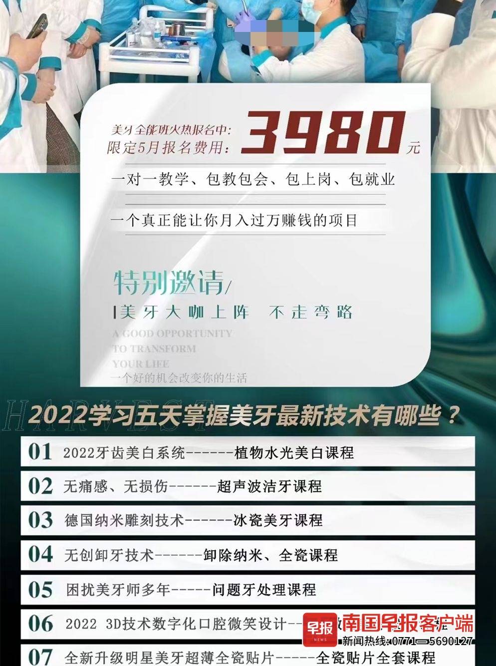 “明星美牙创业班,学费3980元,限定20个名额,先到先得。”在南宁市民族会展路口的另一栋写字楼里,一家店面门口贴出一张美牙师培训班的宣传海报。一名正在帮客户美甲的店员称,该培训由其负责,店里已开展过32期培训班,每人每期学费为3980元,只用培训几天,内容包含牙齿贴片、超声波洁牙、植物水光美白等内容。记者问:“零基础的学员学完之后能自己开店操作吗?”店员回答:“可以。”