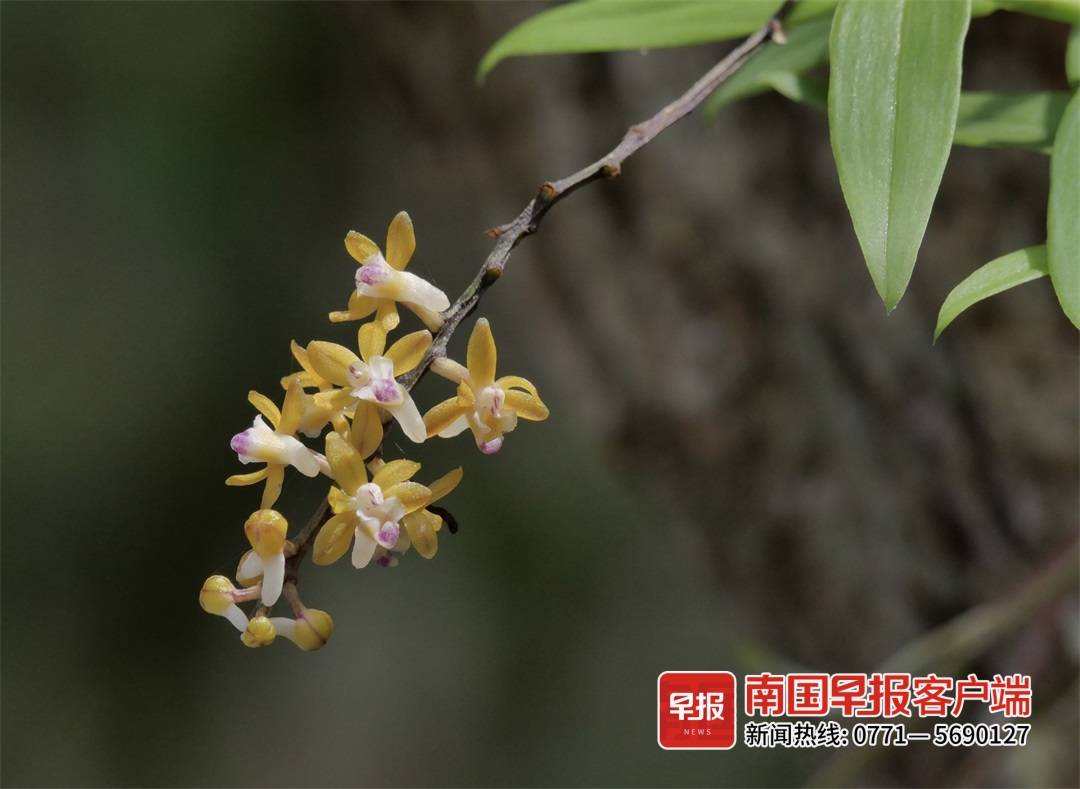 茂密的热带森林是兰花的天堂,很多新品种隐匿其中。今年7月,一株兰花在广西弄岗国家级自然保护区开出了黄白相间的小花,经专家确认,该兰花属于广西新记录种——二齿叶隔距兰,其分布于热带、亚热带地区,此前该种仅见于云南。而在2年前,弄岗保护区护林员农沿新和麻佩南在巡护过程中发现了这株兰花,当时该兰花并非花期。通过持续观察,今年兰花终于开花,正式确定为广西新记录种。