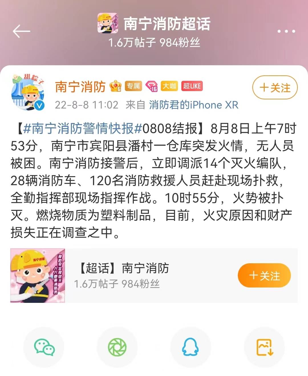▲南宁消防官方微博警情结报截图。