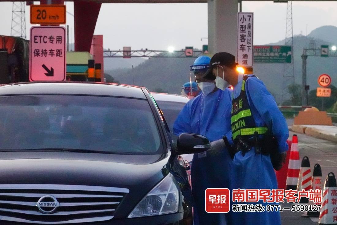 ▲高峰高速出入口,民警对进城车辆进行防疫检查。