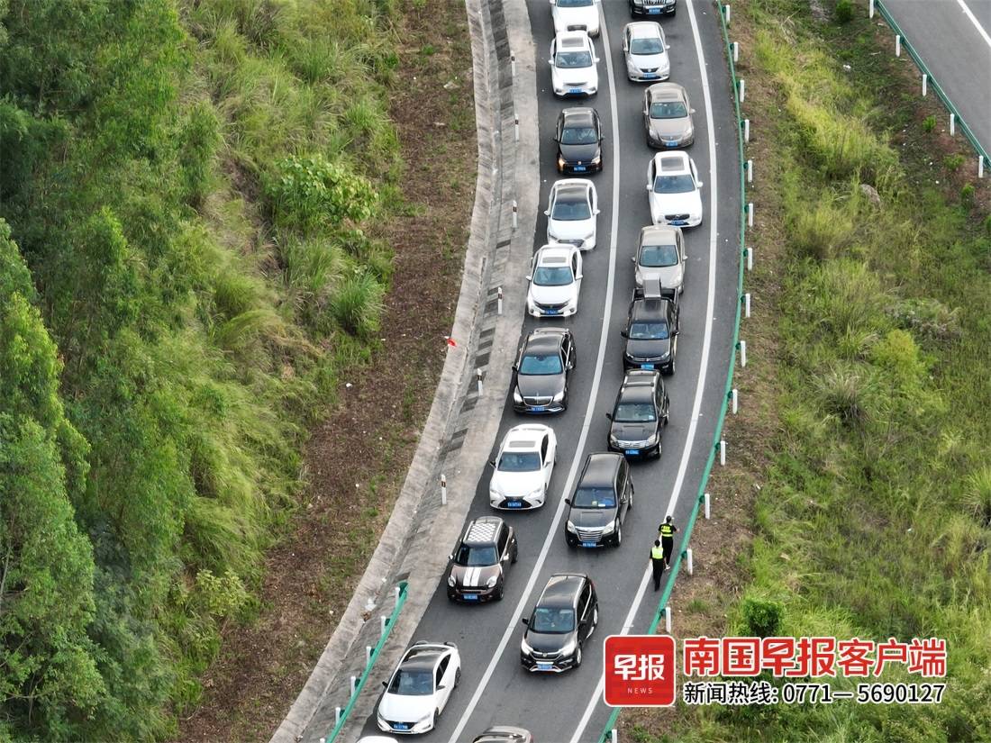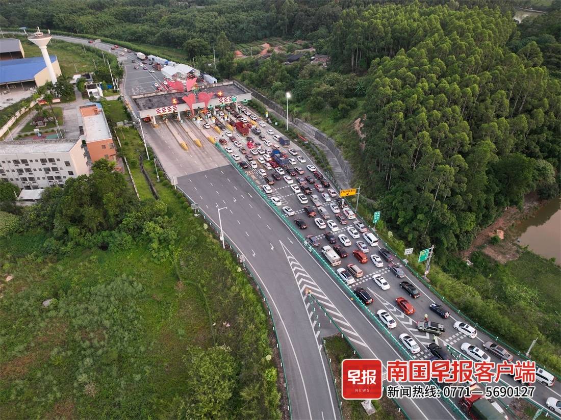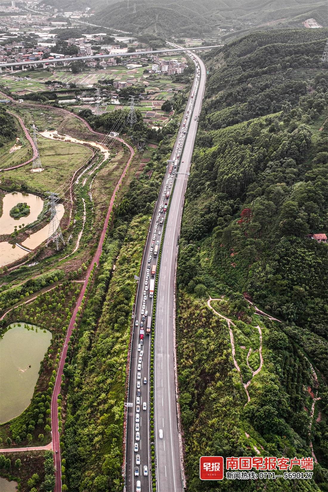 ▲南宁高峰高速出入口的外环高速上,进城的车流排了数公里长。