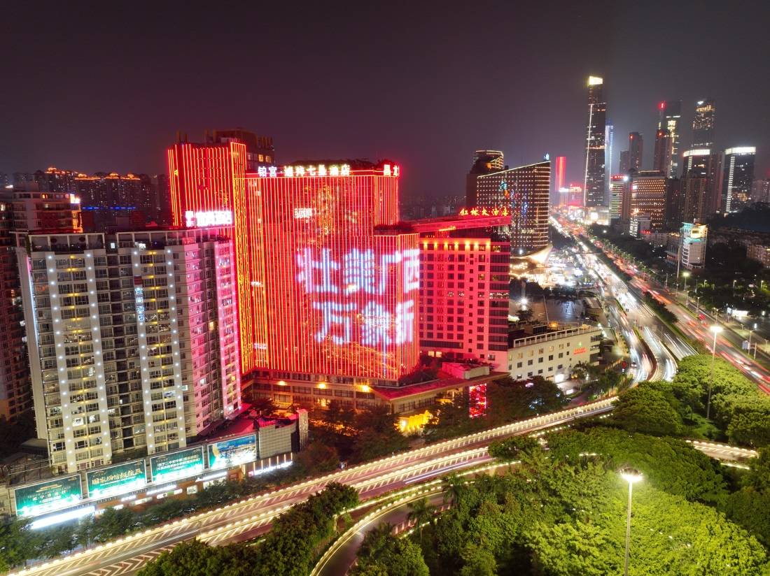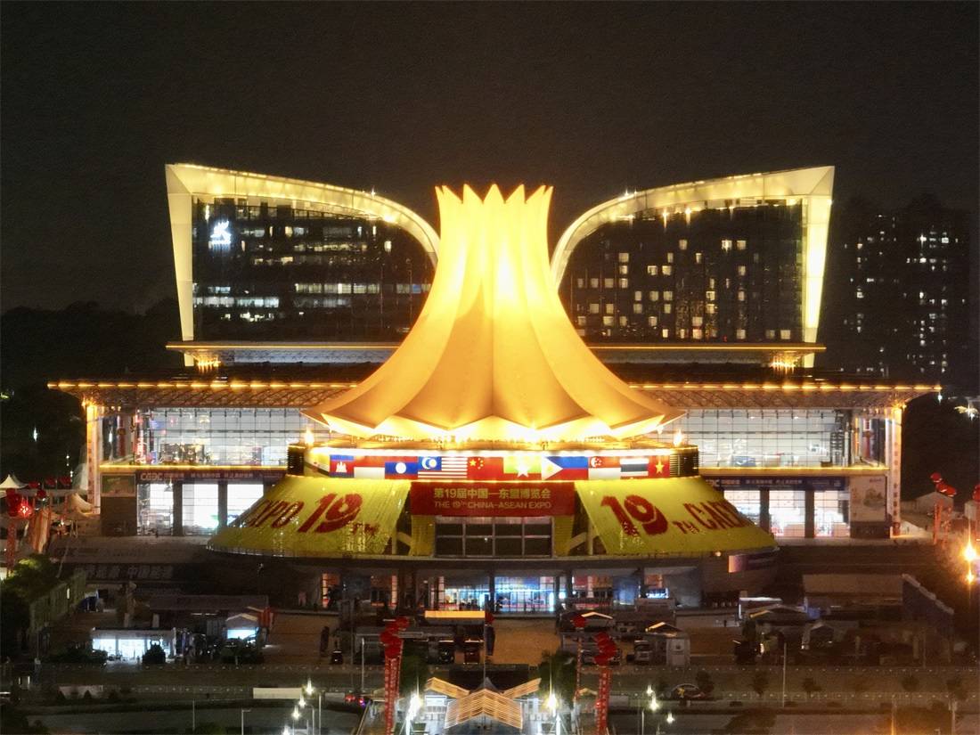 第十九届中国—东盟博览会、中国—东盟商务与投资峰会临近,南宁市入夜后灯火辉煌,沿着民族大道,南宁国际会展中心东西两侧的高楼间流光溢彩,打出“壮美广西万象新”“云上东博聚万商”等标语,城市中弥漫着浓郁的喜庆气氛。