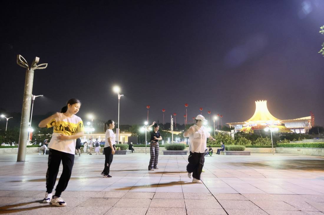 ▲市民在南宁国际会展中心对面跳舞。