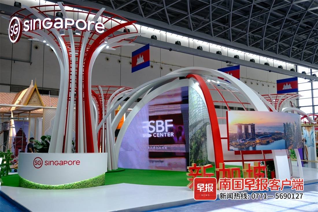 新加坡展区的场景布置选取了地标性建筑之中的滨海艺术中心以及滨海湾花园,作为展馆的“门面担当”。展区造型与新加坡国旗的配色统一,树干式样的造型又如同绽放的绚烂烟花,门口还摆放了不少绿植,令人一睹“花园城市”的风采。本届东博会上,除了进行国家形象展示,新加坡展区还将展出当地特色食品饮料等。
