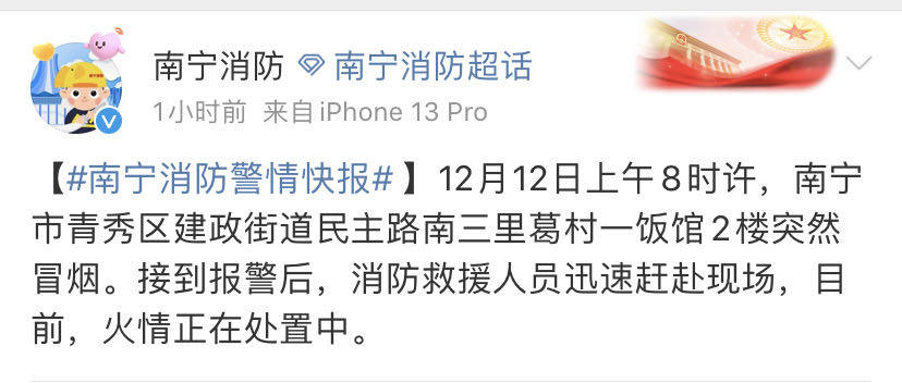 @南宁消防9:08发布警情快报:12月12日上午8时许,南宁市青秀区建政街道民主路南三里葛村一饭馆2楼突然冒烟。接到报警后,消防救援人员迅速赶赴现场。