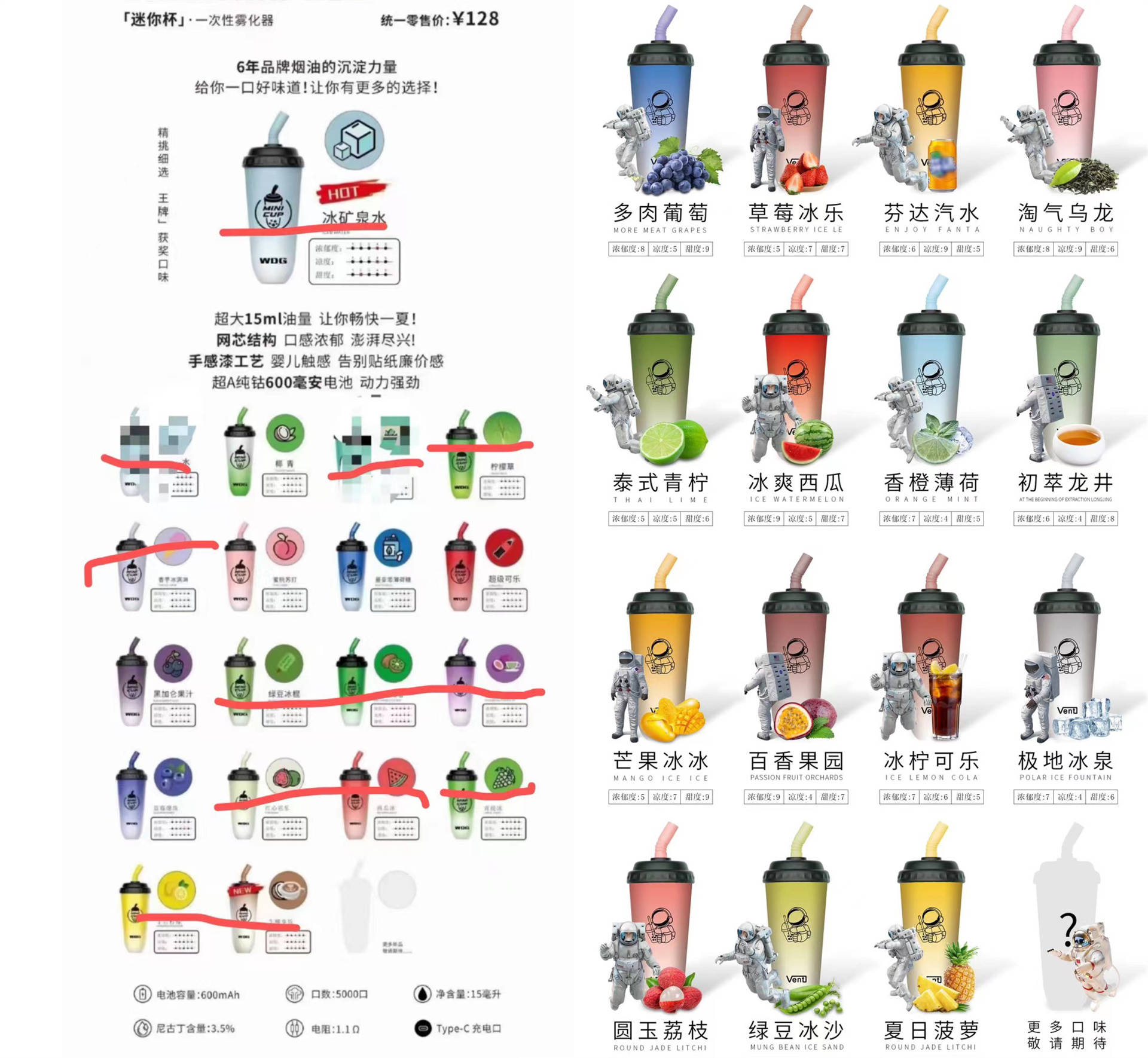 ▲“奶茶杯”“星球杯”等调味电子烟产品口味众多。