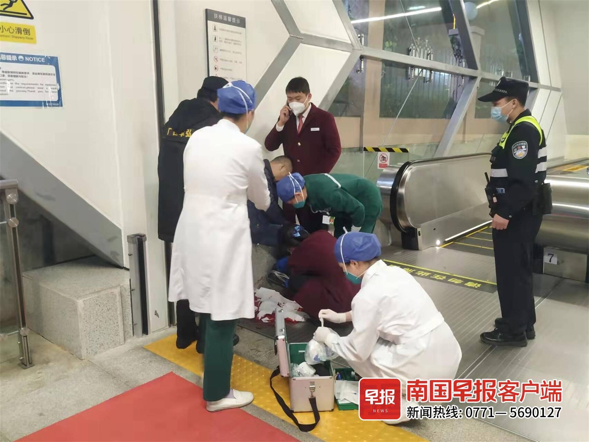 1月15日晚,南宁市地铁3号线长堽路站发生惊险一幕:一名醉酒男子在搭乘自动扶梯时,因站立不稳,摔倒后往下翻滚4圈,致脚踝处被划伤,血流不止。幸好工作人员及时帮忙止血,并将其送至医院救治,目前,该男子已无大碍。(点击查看详情)