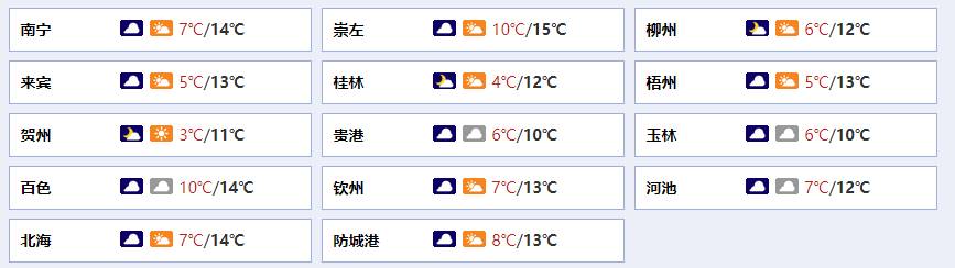南宁市:多云,东北风2~3级,最低温度7℃,最高温度14℃。