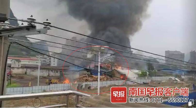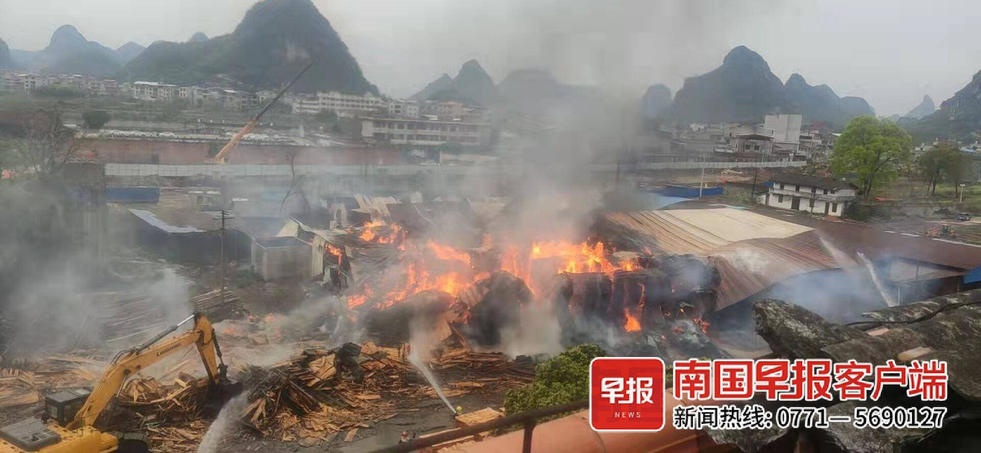 3月29日中午,河池罗城旧火车站附近一木材加工厂突发大火,现场一名司机开挖掘机挖土灭火。