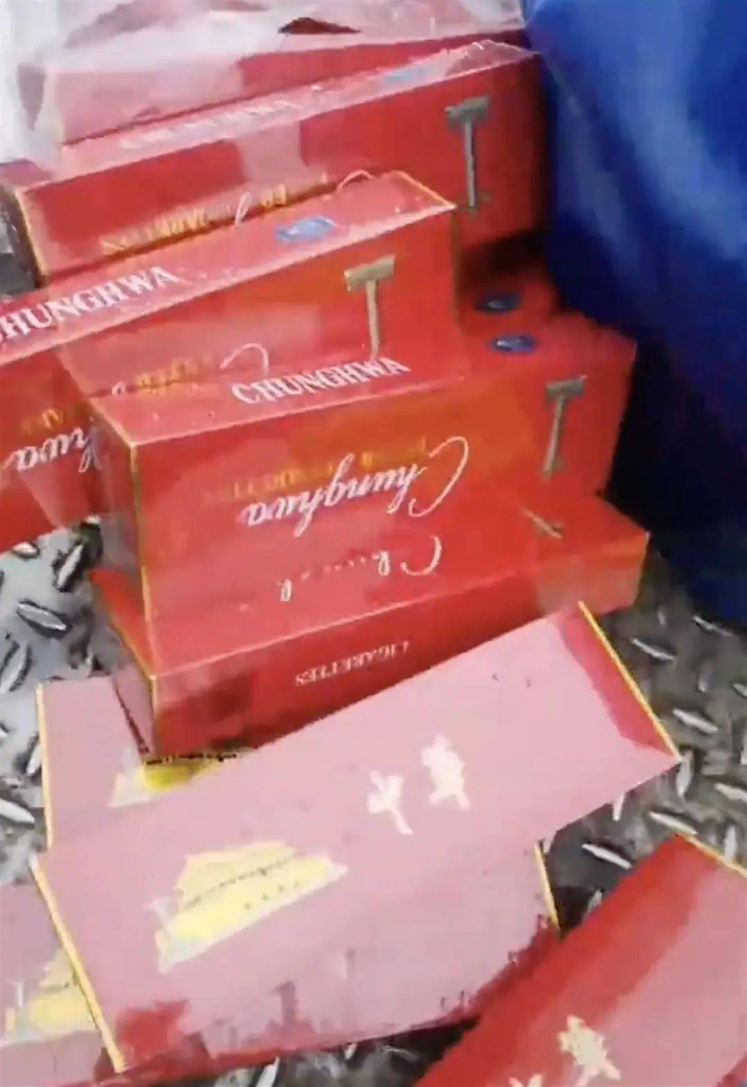 视频显示,一艘渔船上摆放着大批包装完好的香烟,有人员正在一旁分拣,其中有不少是“中华”等名牌香烟,外包装透明薄膜上还留有水珠。另一段视频中能看到,水面上一个黑色箱体漂过,由于体积过大无法用网抄打捞。之后,水面上再度漂来几条香烟,船上人员拿着网抄将其打捞上来,有男子说道:“发财啦,漂洋过海来的,都是宝啊。”