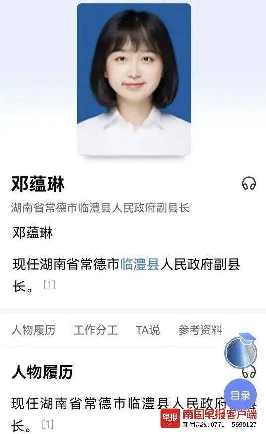 记者查询发现,3日,常德日报客户端发布消息:“近日网传临澧县副县长(挂职)邓蕴琳1994年出生等消息不实,记者向临澧县有关部门核实,邓蕴琳1986年出生,湖南岳阳人,湖南理工学院全日制本科,中南财经政法大学全日制硕士研究生。根据工作需要,2021年1月从湖南省科技厅科技事务中心选派挂职任临澧县副县长(科技),2022年8月已结束挂职锻炼回原单位。”