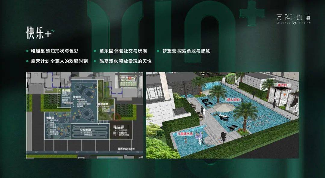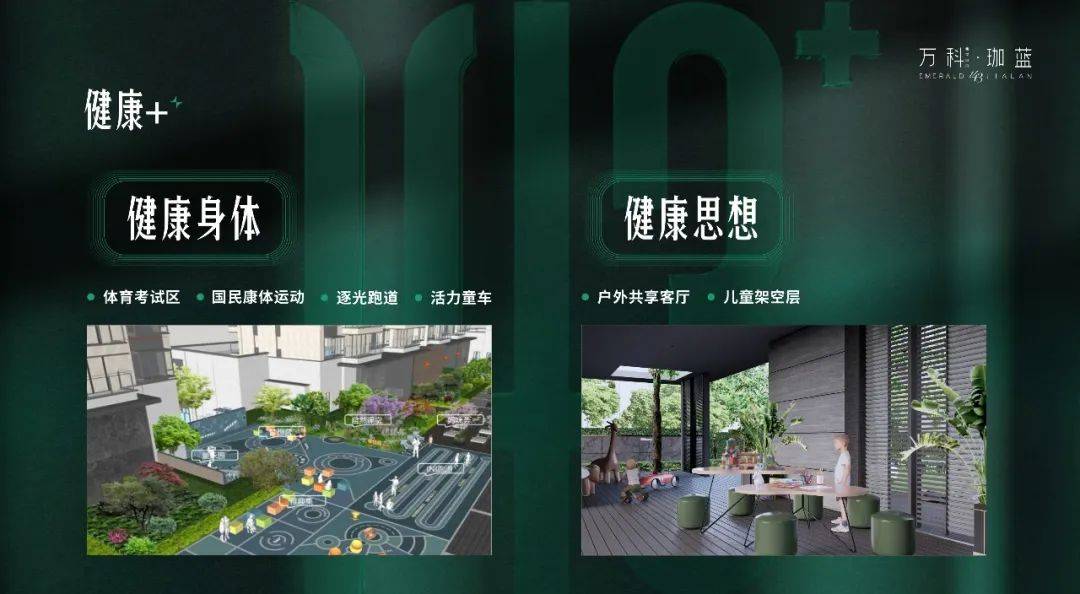 珈蓝结合不同年龄阶段的儿童社交需求提出了儿童友好住区主张:共童成长。通过快乐+、健康+、自然+、安全+四大主题板块,涵盖3大成长周期、21大细节设计、61种玩法,让孩子在翡翠中央更好地成长。