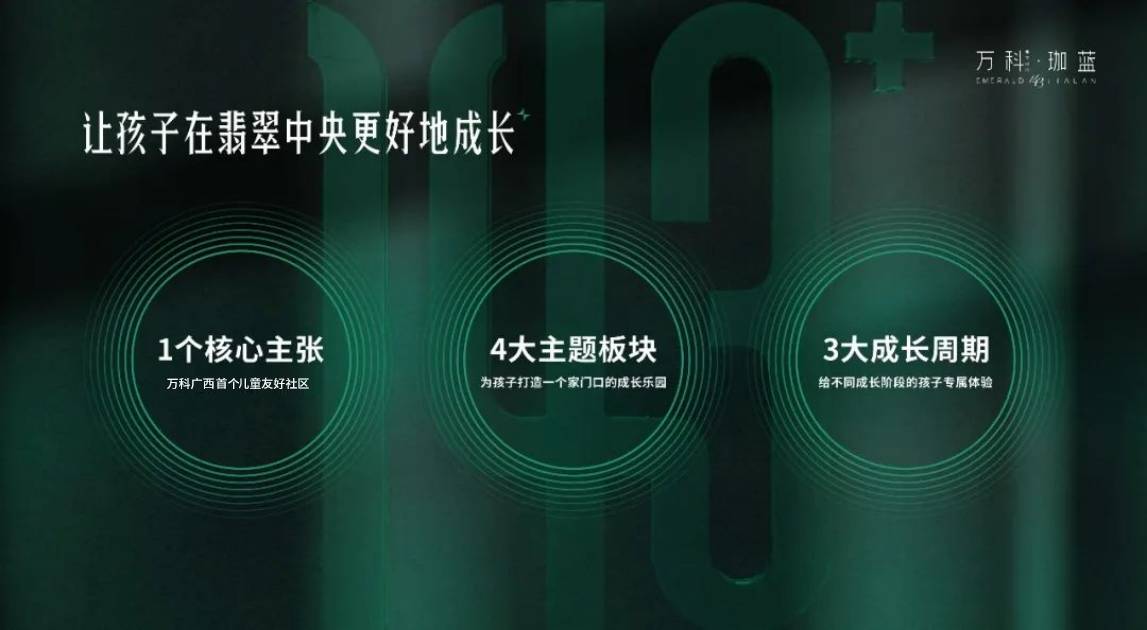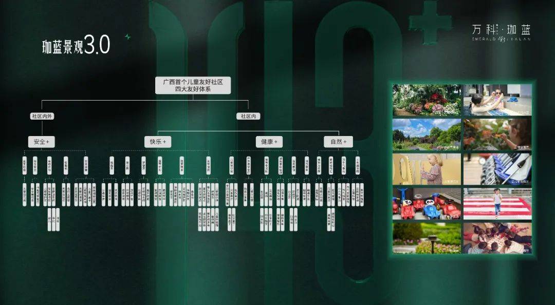 孩子的50%时间都是在社区里度过,一个孩子更安全健康的成长,离不开家庭的保护与教育,更离不开一个安全活力友好的社区。早在2016年佛山万科、长沙万科就开始了针对儿童友好的研发与实践,广西万科总结7年精研经验,提出“1个核心、4大板块、3大主题”全面贯彻儿童友好社区理念,为广西带来万科广西首个玩么儿童友好社区——万科翡翠中央·珈蓝。