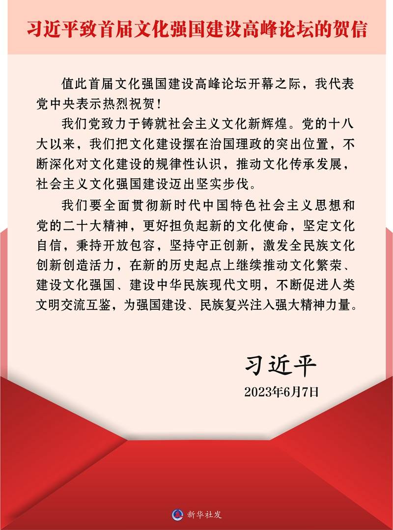 习近平在贺信中指出,我们党致力于铸就社会主义文化新辉煌。党的十八大以来,我们把文化建设摆在治国理政的突出位置,不断深化对文化建设的规律性认识,推动文化传承发展,社会主义文化强国建设迈出坚实步伐。