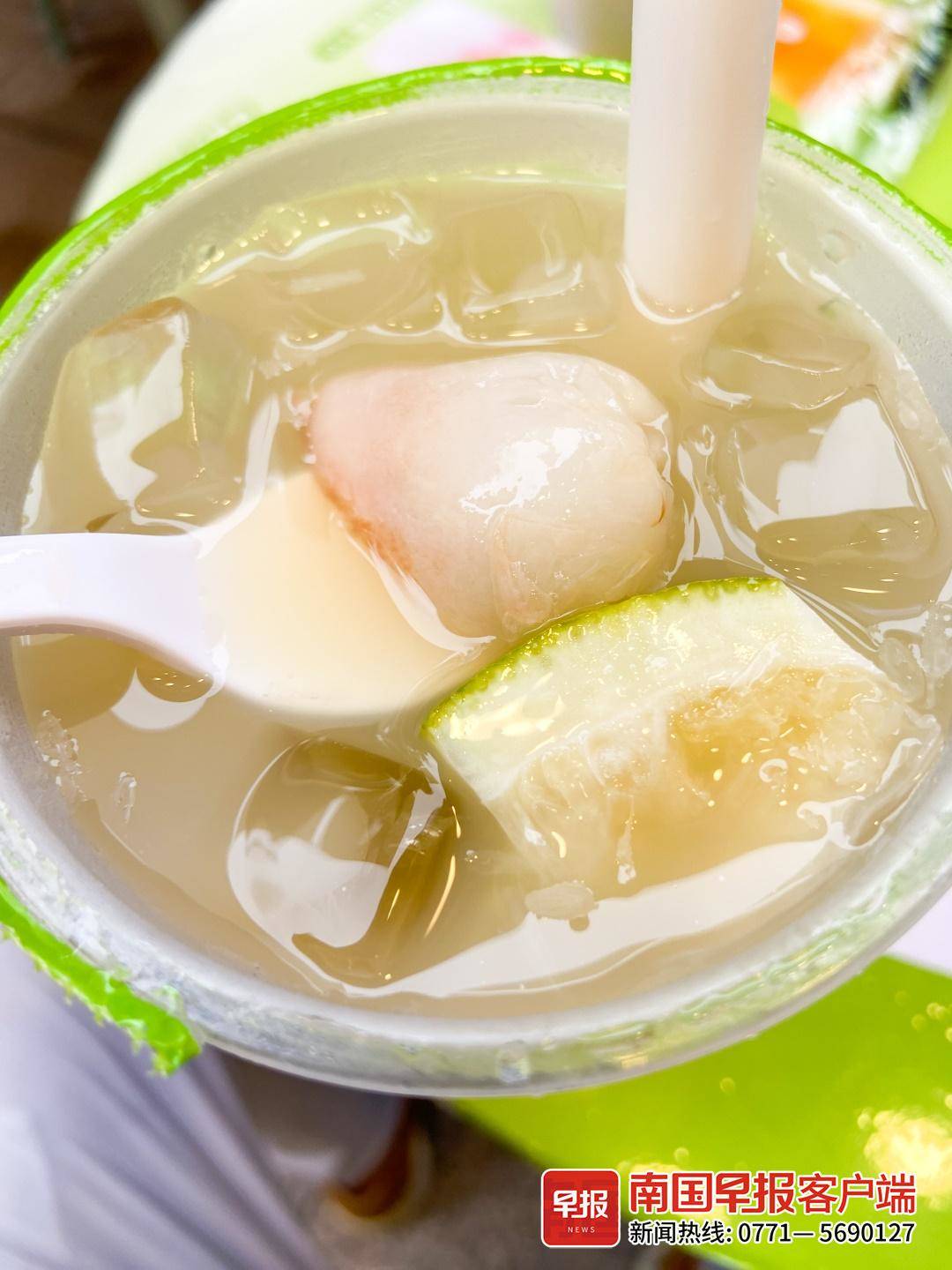 将荔枝融入到饮品中,成了南宁一些奶茶店的夏季招牌。南国早报全媒体记者走访发现,在建政路上,一家奶茶店推出荔枝乌龙、荔枝多肉冰等;明秀东路一奶茶店推出一款“东坡荔枝生椰露”,工作人员称,每杯饮品约含有十颗荔枝。