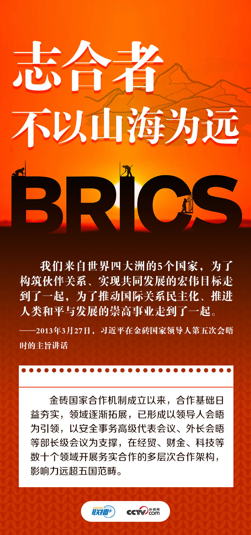 “我们五国虽然山海相隔,但怀着合作共赢的共同目标走到了一起”。“独木不成林。在经济全球化深入发展的时代条件下,金砖国家发展不能独善其身,必须在谋求本国发展的同时促进各国共同发展”。十多年来,习近平主席多次出席或主持金砖国家领导人会晤,论述金砖合作之道,提出“金砖+”合作理念,为推动金砖合作走深走实贡献中国智慧,在金砖国家合作进程中留下深刻的“中国印记”。