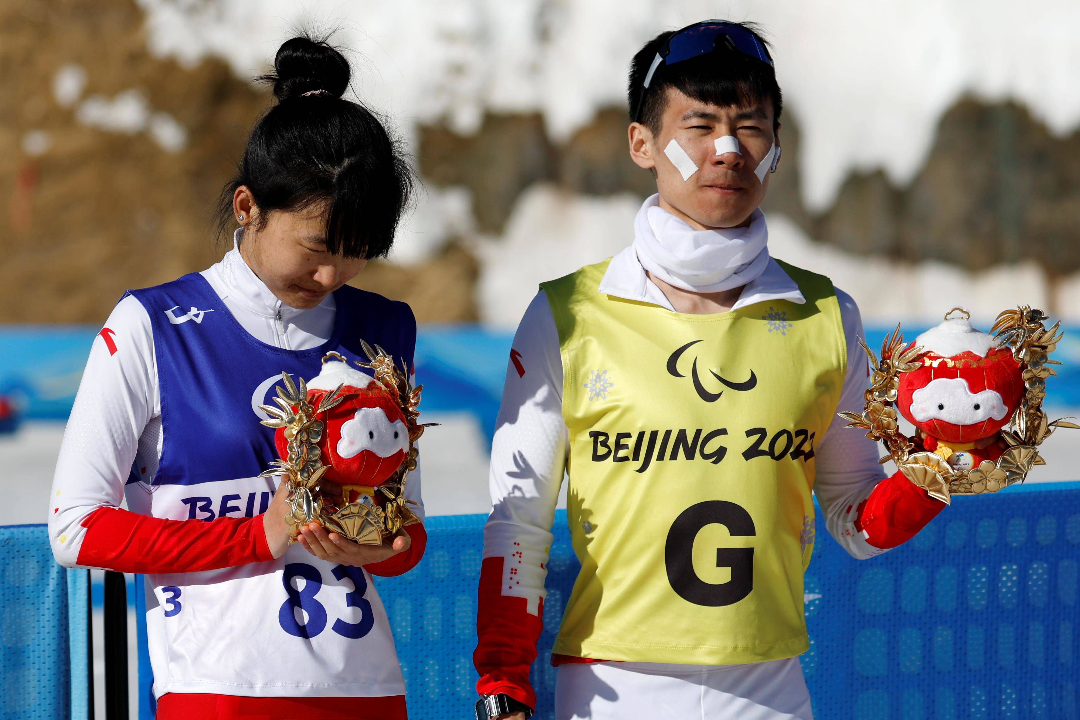 ▲2022年3月8日,2022冬残奥会残奥冬季两项女子中距离(视障)比赛中,中国选手王跃获季军。