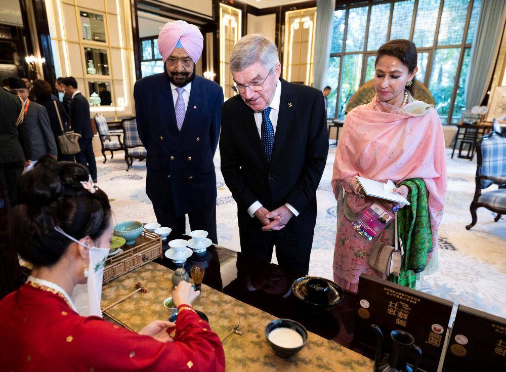 ▲欢迎宴会前,亚奥理事会代理主席辛格和夫人维尼塔、国际奥委会主席巴赫欣赏非遗展示。